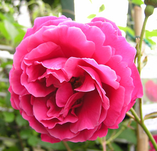 意外に花持ちもよく、着いたあとに、風雨の強い日も多かったのですが、それにも耐えて、すべてのツボミが花を咲かせてくれました。この両脇は、淡い色のバラが咲いています。