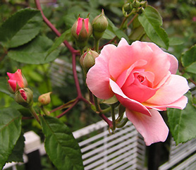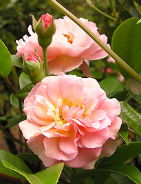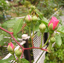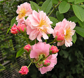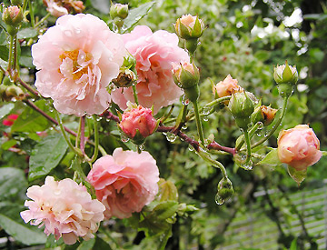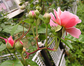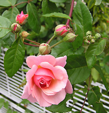 小さい房を作り、たくさんのツボミを付けます。色は、淡いピンクで咲いたり、アプリコットが強かったり。 とにかく、ツルが伸びます。2年目でぐんぐん、ぐんぐん伸びて、さすがにツルバラの伸びは違うと思い知りました。 香りについては、強くはないのですが、ムスクの香りというのでしょうか、私には苦手な香りでした (>_<) |