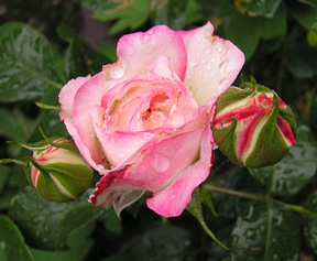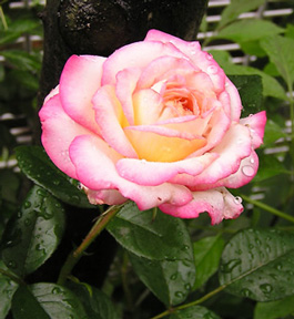 | 月桂樹の木の下、房咲きでたくましく咲いてくれています。2002年は、肥料をたっぷり上げたせいか、花が大きく、花付きがよかったです。太陽の当たり具合で、ピンクのぼかしの入り具合が変わる。 非常に強い四季咲き性です。 |