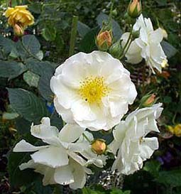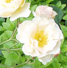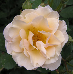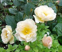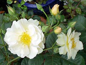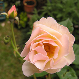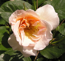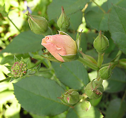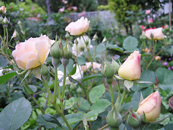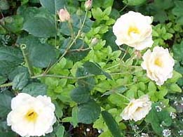 | ペネロペ(H.Msk) ペネロープとも呼ばれる (Penelope) 2002年5月、近所のお花やさんのスタンプカードがいっぱいになって、1000円以内のお花をゲット♪ ちょうど新苗の時期だったので、他のお花も買えました。 「オフェリア」を交配親として作られた四季咲きの半ツルバラ。ほんのり香る。 |
