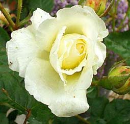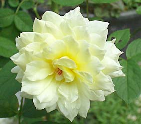 中心が金色がかったクリーミーホワイトのカップ咲き。花弁数80枚のオールドローズ風。ミルラの香り。低性の株立ち。