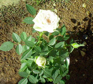 2001年秋から出回り始めたミニバラです。近所の花屋さんで購入。 本来は重ねの多い花びらで、ベージュと淡いグリーンの入り交じった上品な色ですが、光の関係でディテールが消えてしまいました。(^_^;) |
