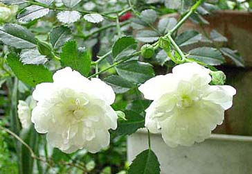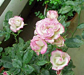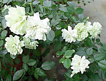 2000年、近所の花屋さんで購入。結構しっかりした大株になり、花付きも抜群。花の形は開きかけのまま、最後まで形が崩れない。スプレーローズという分類でも出ている。 |